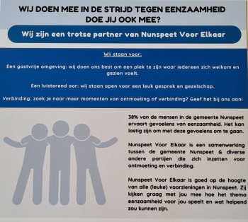 Om gezamenlijk de strijd tegen eenzaamheid in Nunspeet aan te gaan is een coalitie gevormd. Wij Leemans Adviseurs zelfstandig adviseur van Regiobank en verschillende andere bedrijven en stichtingen uit Nunspeet hebben zich hierbij aangesloten. Wij hopen op deze manier eenzaamheid beter de signaleren en bespreekbaar te maken. Er zijn al prachtige initiatieven. Het is belangrijk dat meer mensen weten dat deze initiatieven bestaan. Hoe kunnen we dit beter onder de aandacht brengen? Wij geloven dat we moeten beginnen bij het bespreekbaar maken van eenzaamheid. Laten we dat vooral doen!. Als jij of iemand die je kent zich eenzaam voelt stuur een mail naar info@signaalpuntnunspeet.nl. Noah Koning is het aanspreekpunt en kan je met zijn enthousiasme meer vertellen.